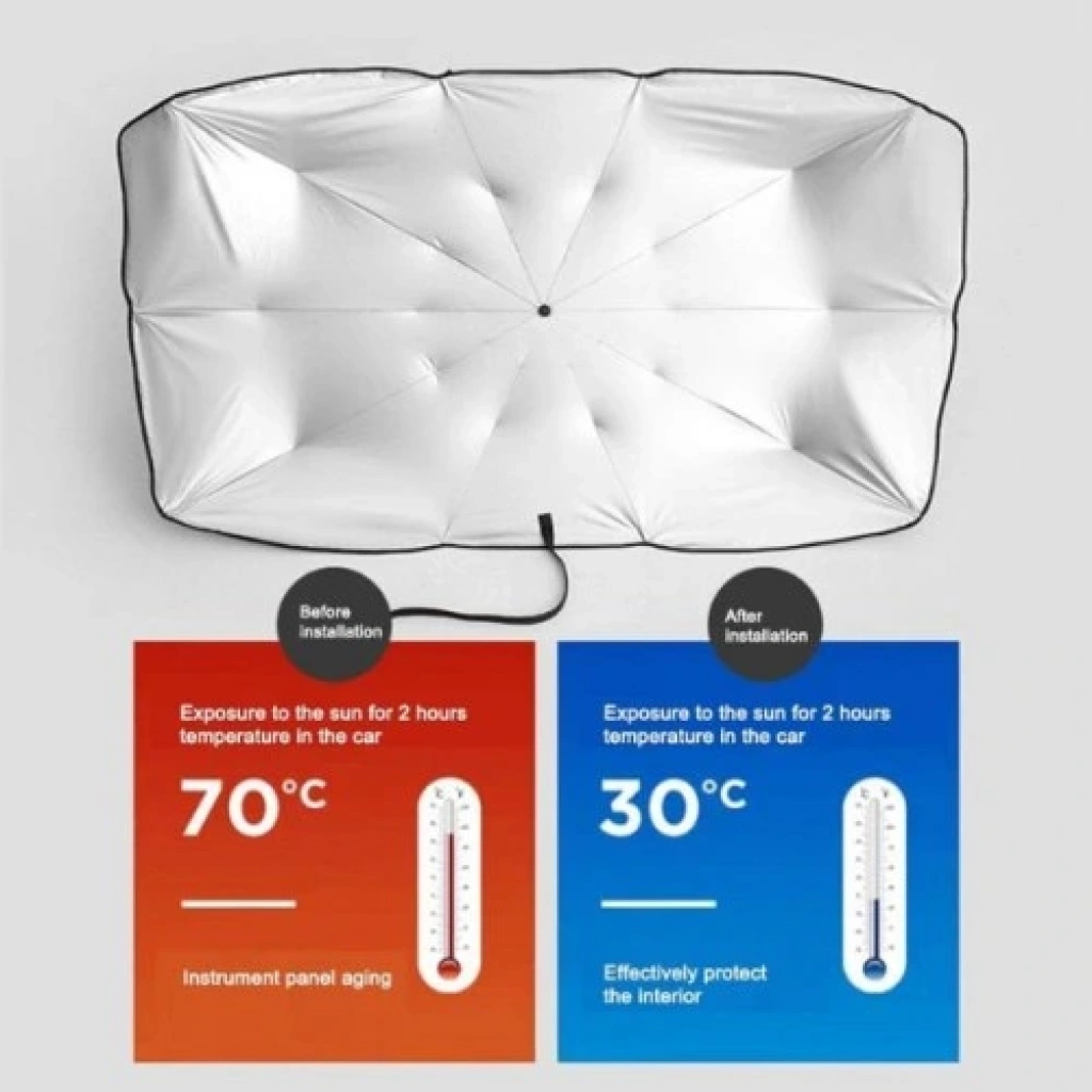 Araba Ön Cam Güneşlik Şemsiye (Katlanabilir) - UV Korumalı, Kolay Kurulum Oto GüneşliğiYaz sıcaklarında aracınızın bir fırına dönüşmesine son verin! Araba Ön Cam Güneşlik Şemsiye, pratik, katlanabilir şemsiye mekanizması sayesinde saniyeler içinde ön camınızı tamamen kapatarak aracınızı Güneş'in zararlı etkilerinden korur. Bu yenilikçi güneşlik, geleneksel modellerin aksine, açılıp kapanması son derece kolaydır.Ürünün Temel Özellikleri ve Avantajları:Üstün Isı ve UV Koruması: Güneş ışınlarına ve ısıya dayanıklı dayanıklı malzemeden (dış yüzeyde ısı yansıtıcı gümüş/iç yüzeyde siyah kaplama) üretilmiştir. UV ışınlarını yansıtarak aracınızın içini serin tutar ve konforunuzu maksimize eder.Şemsiye Mekanizması: Kolay Kurulum ve söküm imkanı sunan katlanabilir yapısı sayesinde, tıpkı bir şemsiye gibi hızla açılır ve yerine oturur (Görsel 5).Geniş Gölgeleme Alanı: Geniş ve esnek tasarımı (Görsel 4'teki boyutlar: ~130-145 cm genişlik, ~79 cm yükseklik) sayesinde ön camın tamamını gölgeleyerek direksiyon, koltuk ve gösterge panelini güneşin yol açtığı solma ve bozulmalara karşı korur.Kompakt ve Taşınabilir: Kullanılmadığında şık, küçük bir deri kılıf içinde toplanır (Görsel 3), torpido gözünde veya kapı cebinde az yer kaplar ve kolayca taşınabilir.Yakıt Tasarrufu: Aracınızın iç ısısını düşürerek klimanın daha az çalışmasına olanak tanır, bu da dolaylı olarak yakıt tasarrufu sağlar.Bu araba ön cam şemsiyesi ile aracınızın ömrünü uzatın ve sıcak yaz günlerinde konforunuzu artırın.