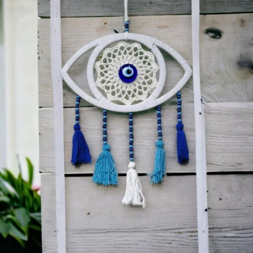 Beyaz dantelli ponponlu duvar süsümüz el emeği göz nuru ile üretilmiştir. Nazar boncuk göz modelli duvar süsümüz boncuklarla süslenmiştir.Ürünümüzün eni 29 santimetre, göz boyu 17 santimetre, ip dahil uzunluğu 57 santimetredir.Nazar boncuğunun koruyucu özelliğiyle birleşen dantel ve ponponların zarif görünümü, bu duvar süsünü benzersiz kılıyor. Hem modern hem de geleneksel dekorasyonlara uyum sağlayan bu ürün, evinizin her köşesini güzelleştirecek.