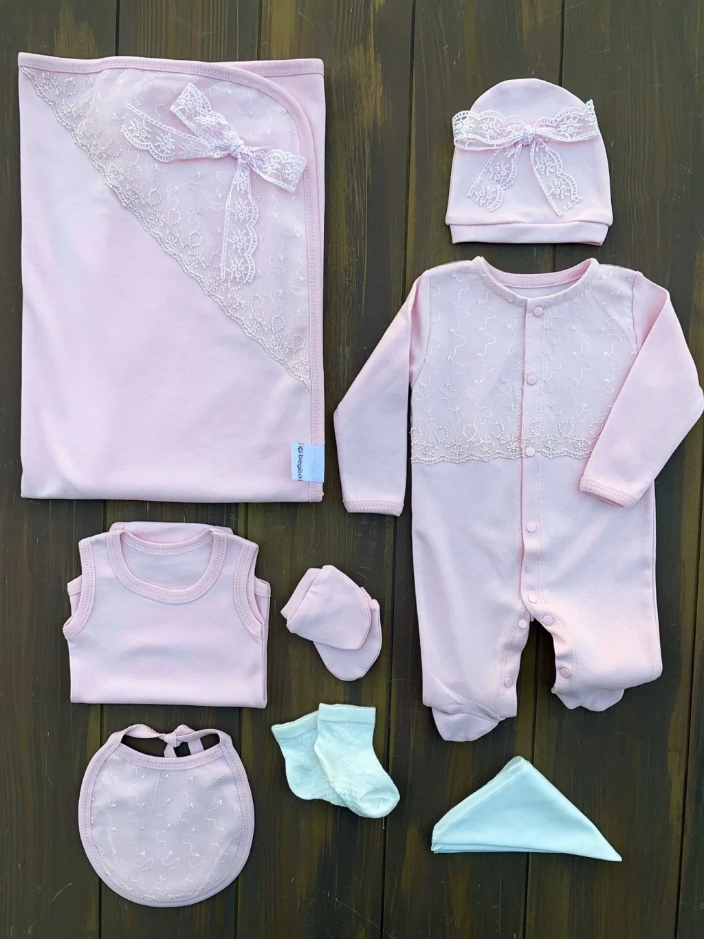 HERŞEYTREND Dantel İşlemeli Lale Desenli 7 Parça Hastane Çıkış Seti %100 Pamuk