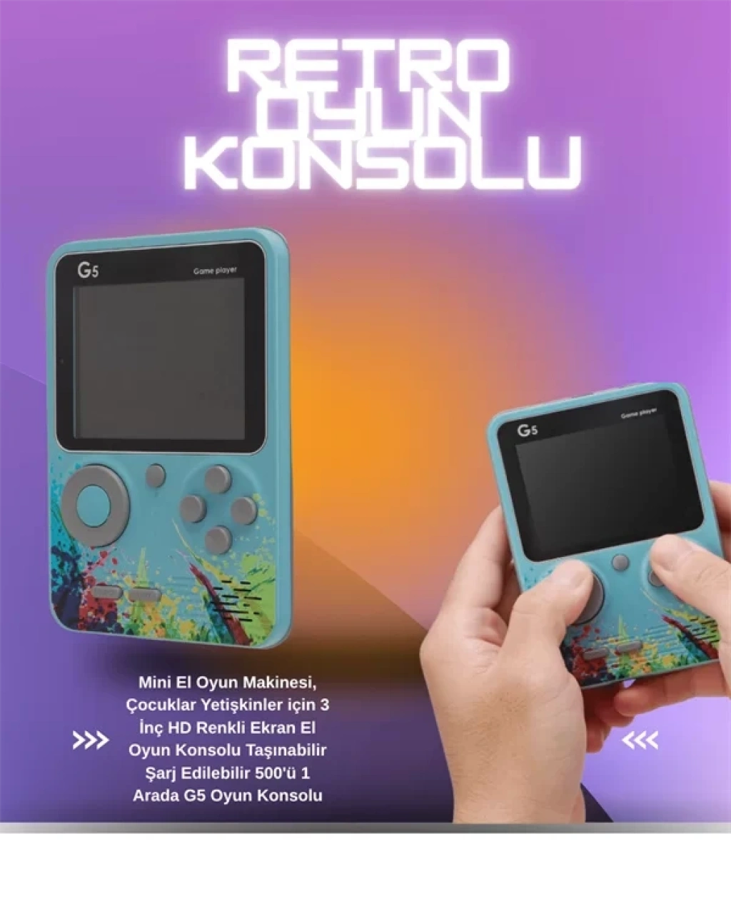 Gelişmiş renkli 3 inç LCD ekranı, oyun deneyimini daha net ve canlı hale getirirken, ergonomik tuş yerleşimi sayesinde uzun süreli kullanımda konfor sağlar. Oyunlar doğrudan cihazın hafızasına yüklü olarak geldiği için ekstra indirme, kurulum veya internet bağlantısına gerek yoktur.USB kablo ile şarj edilen dahili bataryası, tek şarjla uzun süreli kullanım sağlar. Elektrik bağımlılığı olmadan özgürce oyun oynayabilirsiniz. Dayanıklı plastik kasası, düşmelere ve çizilmelere karşı dirençlidir. G5 Game Box, hem geçmişin oyunlarını yaşatmak isteyen yetişkinler hem de keşfetmeye hevesli çocuklar için eğlenceli, kullanışlı ve duygusal değeri yüksek bir cihazdır.
