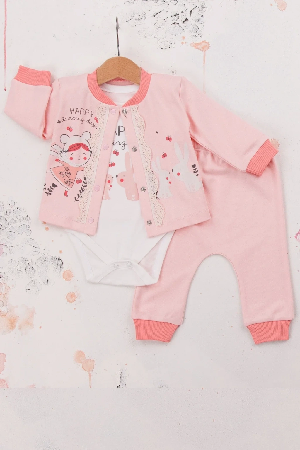 HERŞEYTREND Happy Dancing Desenli 3'lü Hırkalı Kız Bebek Takım
