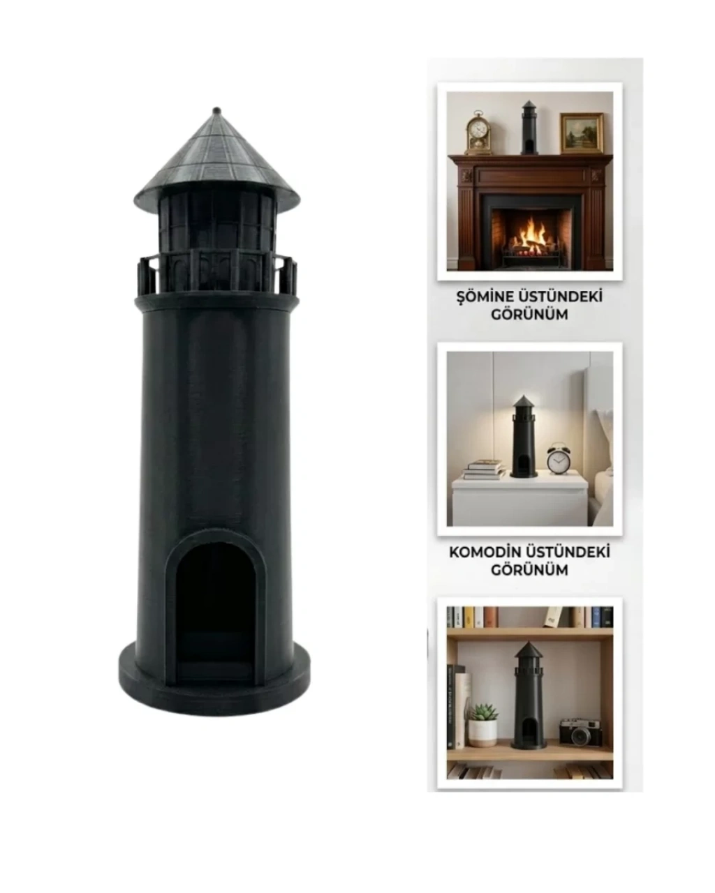 Modern tasarım anlayışı ile üretilen 3D siyah deniz feneri dekor objesi, bulunduğu ortama estetik ve güçlü bir hava katar. Üç boyutlu detayları sayesinde gerçekçi bir görünüm sunar ve dekorasyonun odak noktası haline gelir.Minimalist, endüstriyel ve çağdaş dekorasyon stilleriyle uyumlu olan bu ürün, özellikle siyah ve gri tonlu alanlarda bütünlük sağlar. TV ünitesi, salon sehpası, antre veya ofis masası üzerinde rahatlıkla kullanılabilir.Hafif ve dayanıklı yapısı sayesinde pratik kullanım sunar. İsteğe bağlı olarak iç kısmı ışıklandırılarak gece ambiyansı oluşturulabilir. Ev aksesuarı, masa üstü dekor ürünü ve hediye alternatifi olarak tercih edilebilecek şık bir tasarımdır.