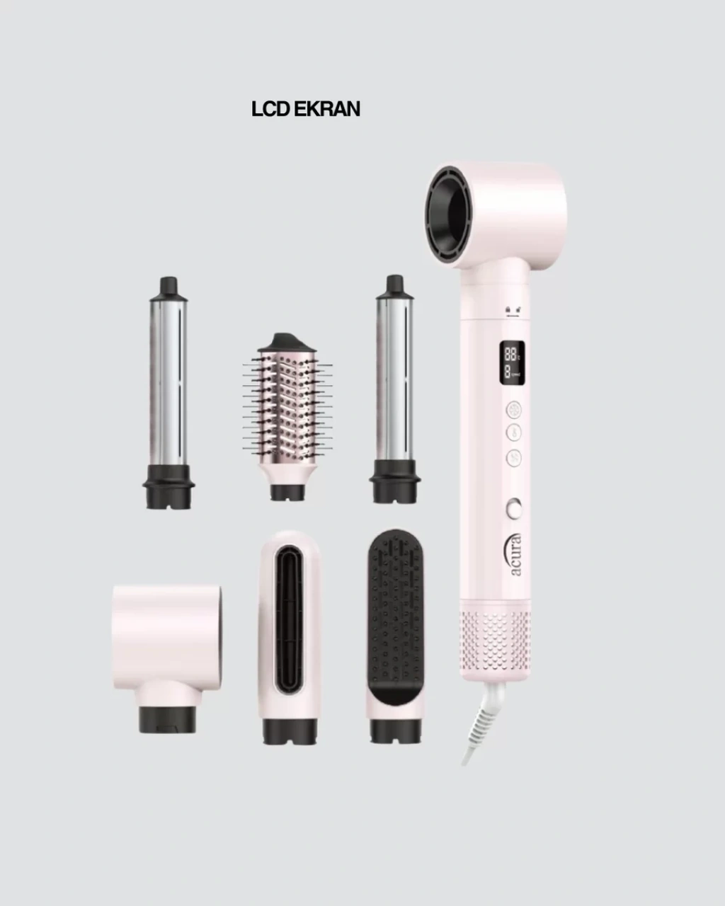 Airstyle 6-in-1 Saç Şekillendirme Seti, teknolojiyi saç bakım rutininize entegre eden yenilikçi bir üründür. Gelişmiş motor yapısı ve akıllı ısı kontrol sistemi sayesinde saçlarınıza zarar vermeden etkili sonuçlar elde etmenizi sağlar.110.000 rpm motor hızı, güçlü fakat dengeli hava akışı sunarak saçların hızlı şekilde kurumasına yardımcı olur. Bu sayede saç telleri yüksek ısıya uzun süre maruz kalmaz ve doğal yapısını korur. Negatif iyon teknolojisi, saç kütikülünü kapatarak parlaklık ve yumuşaklık kazandırır.LCD ekranlı kontrol paneli, kullanım sırasında anlık bilgi sunar. 3 kademeli sıcaklık ve hız ayarı, farklı saç tiplerine uygun kişisel ayarlamalar yapmanıza olanak tanır. Akıllı ısı kontrolü, saçın aşırı ısınmasını önleyerek kırılma ve kuruma riskini azaltır.Çoklu başlık seçenekleri, cihazın kullanım alanını genişletir. Bukle başlıkları ile hacimli ve doğal dalgalar, düzleştirme fırçası ile pürüzsüz saçlar elde edilebilir. Hacimlendirici fırça, saç diplerinden itibaren dolgun bir görünüm sunar.Soğuk üfleme özelliği, şekillendirme işlemi sonrasında saçın formunu sabitlemeye yardımcı olur. Ergonomik tasarımı ve hafif yapısı, uzun süreli kullanımlarda konfor sağlar. Evde profesyonel saç şekillendirme deneyimi yaşamak isteyenler için ideal bir settir.2 yıl garanti desteği ile sunulan bu ürün, güvenli ve uzun ömürlü kullanım sağlar. Günlük saç bakımını pratik hale getirirken estetik sonuçlar elde etmenizi mümkün kılar.