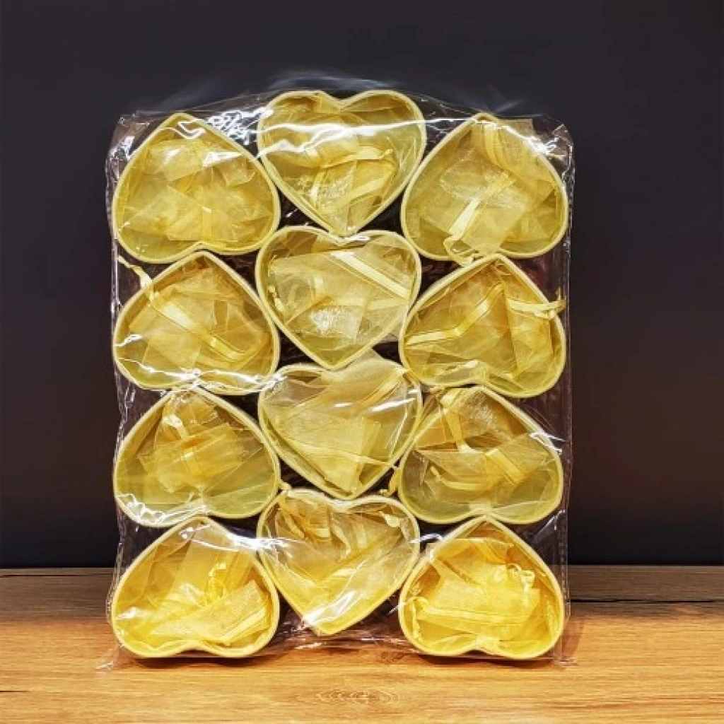 Kalpli Tül Kese – Gold RenkGold rengi ve zarif kalp tasarımıyla dikkat çeken Kalpli Tül Kese, özel günlerin en şık detaylarından biridir. Parlak ve gösterişli görünümü sayesinde nişan, söz, düğün, kına gibi özel organizasyonlarda küçük hediyelerinizi şık bir şekilde sunmanıza olanak tanır.İçine çerez, lavanta, şekerleme veya küçük hediyelikler koyabileceğiniz bu tül kese, her ortamda zarif bir dokunuş sağlar. Kalp desenli tül yapısı ve simli detaylarıyla, klasik tül keselerden çok daha dikkat çekici bir duruş sergiler.Ürün Özellikleri:Kaliteli tül malzemeden üretilmiştir.Kalp kutu üzerinde ışıltılı sim detayları bulunmaktadır.Şık ve zarif tasarımıyla özel günlerde dikkat çeker.Nişan, söz, düğün ve kına organizasyonlarında kullanıma uygundur.Kına kesesi çeşitlerinin vazgeçilmezidir.Kullanım Alanları:Nişan malzemesi, söz malzemesi, düğün ve kına malzemesi olarak tercih edilebilir.Ürün Ölçüsü:Standart tül kese boyutlarındadır (yaklaşık 16 cm).