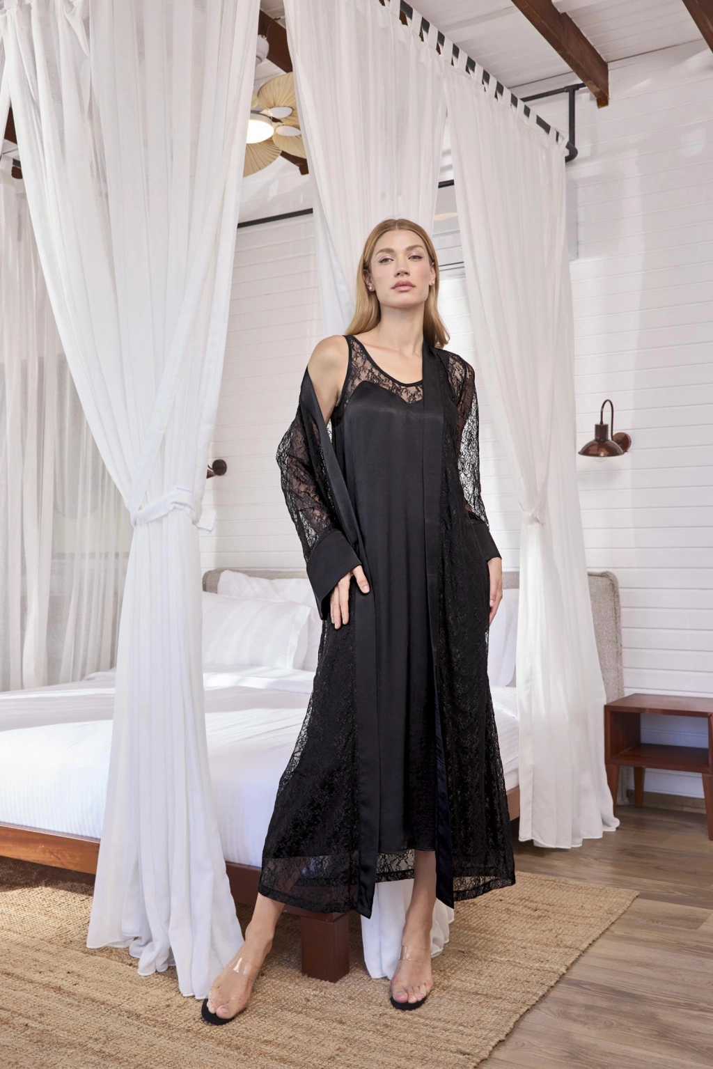 Gecelik: Siyah renklidir, derin V yakalıdır, sırt ve göğüs dekoltelidir, yakası dantellidir, kalın askılıdır, dokuma kumaştır.
