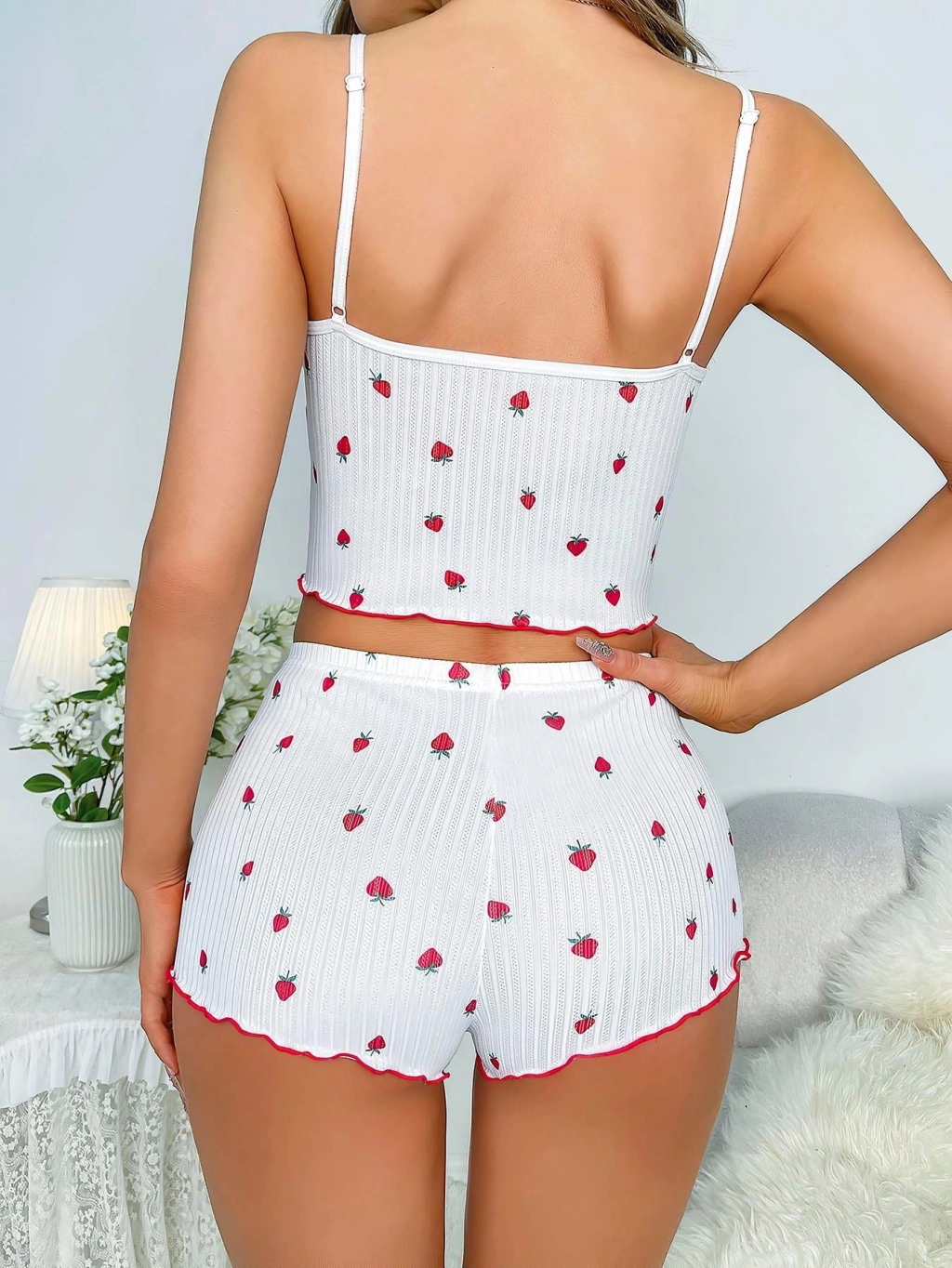Tatlı ve enerjik görünümüyle öne çıkan bu pijama takımı, beyaz üzerine serpiştirilmiş çilek desenleriyle fresh bir tarz sunuyor. İnce askılı üstü ve rahat kesim şortu sayesinde hem şık hem de konforlu bir kullanım sağlar.