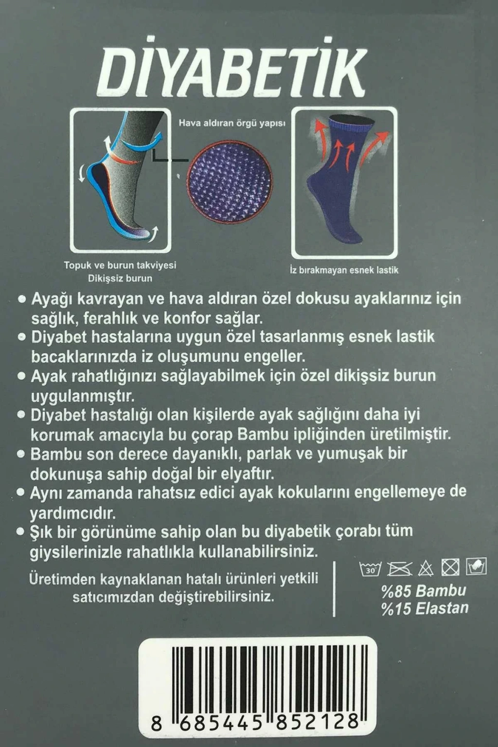 | 6 Adet Erkek Bambu Lastiği Sıkmayan Diyabetik Çorap Ayağı kavrayan ve hava aldıran özel dokusu ayaklarınız için sağlık, ferahlık ve konfor sağlar. Diyabet hastalarına uygun özel tasarlanmış esnek lastik bacaklarınızda iz oluşumunu engeller. Ayak rahatlığınızı sağlayabilmek için özel dikişsiz burun uygulanmıştır. Diyabet hastalığı olan kişilerde ayak sağlığını daha iyi korumak amacıyla bu çorap Bambu ipliğinden üretilmiştir. Bambu; son derece dayanıklı, parlak ve yumuşak bir dokunuşa sahip doğal elyaftır. Aynı zamanda rahatsız edici ayak kokularını engellemeye de yardımcıdır. Şık bir görünüme sahip olan bu diyabetik çorabı tüm giysilerinizde rahatlıkla kullanabilirsiniz. % 85 Bambu % 15 Elestandır. 40-45 numara için uygundur. |