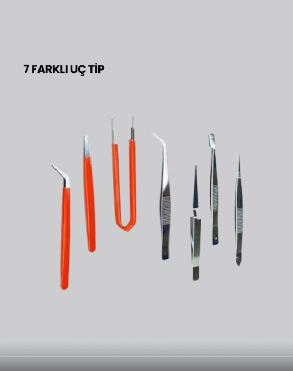 Bu 7’li hassas cımbız seti, elektronik tamir ve ince işçilik gerektiren tüm uygulamalarda profesyonel performans sunmak üzere tasarlanmış kapsamlı bir araç setidir. Paslanmaz karbon çelik malzemesi sayesinde dayanıklı, uzun ömürlü ve yüksek hassasiyetle çalışan bir yapıya sahiptir. Set içerisindeki her bir cımbız farklı uç tipiyle öne çıkar; düz uçlu, kavisli uçlu, ince uçlu, eğimli uçlu ve geniş uçlu seçenekler sayesinde her görev için doğru cımbızı kolayca seçebilirsiniz.Elektronik devrelerde güvenli kullanım için her cımbız antistatik ESD kaplama ile güçlendirilmiştir. Bu kaplama, statik elektriği nötralize ederek anakart, çip, sensör ve küçük elektronik bileşenlerin zarar görmesini önler. Özellikle bilgisayar tamiri, cep telefonu tamiri ve hassas elektronik bileşenlerle çalışan kullanıcılar için vazgeçilmez bir avantaj sunar.Manyetik olmayan uçlar, minik vidalar ve metal parçalarla çalışırken tutuşun kaymasını engeller. Bu özellik, küçük bileşenleri yerleştirirken daha kontrollü hareket etmenizi sağlar. Model yapımı, elektronik hobi projeleri, dron tamiri, saat mekanizması onarımı gibi çalışmalar için ideal bir tercih haline gelir.Ergonomik tasarımı sayesinde el yorgunluğunu azaltır ve uzun süre kesintisiz çalışmayı mümkün kılar. Uçların ince ve hassas yapısı, en küçük parçaları bile kolayca kavramayı sağlar. Set, profesyoneller ve teknik hobi meraklıları için mükemmel bir araçtır.