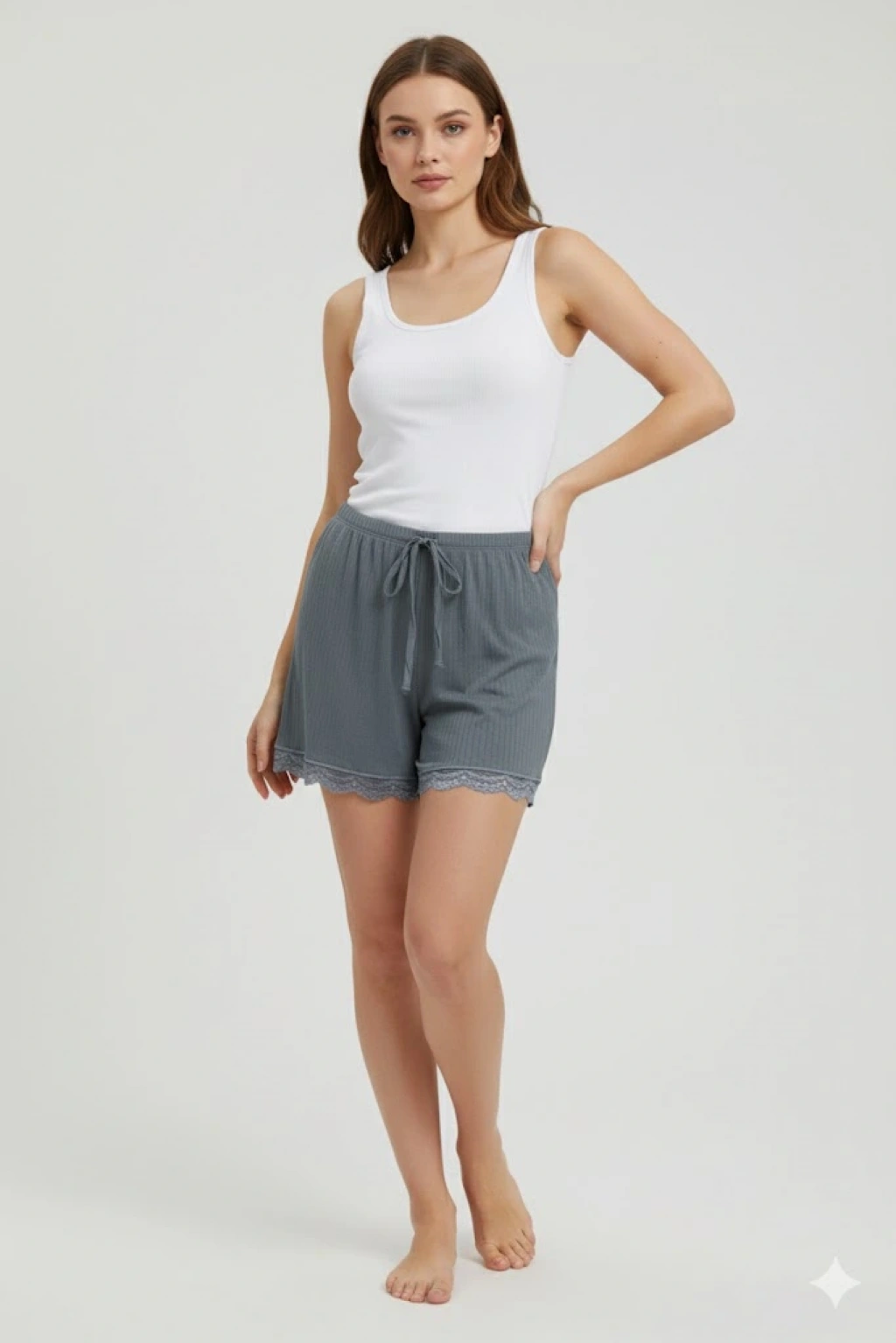 HERŞEYTREND Bambu Fitilli Kadın Ev Şortu Bacak Dantel Detaylı Ev Giyim Gri