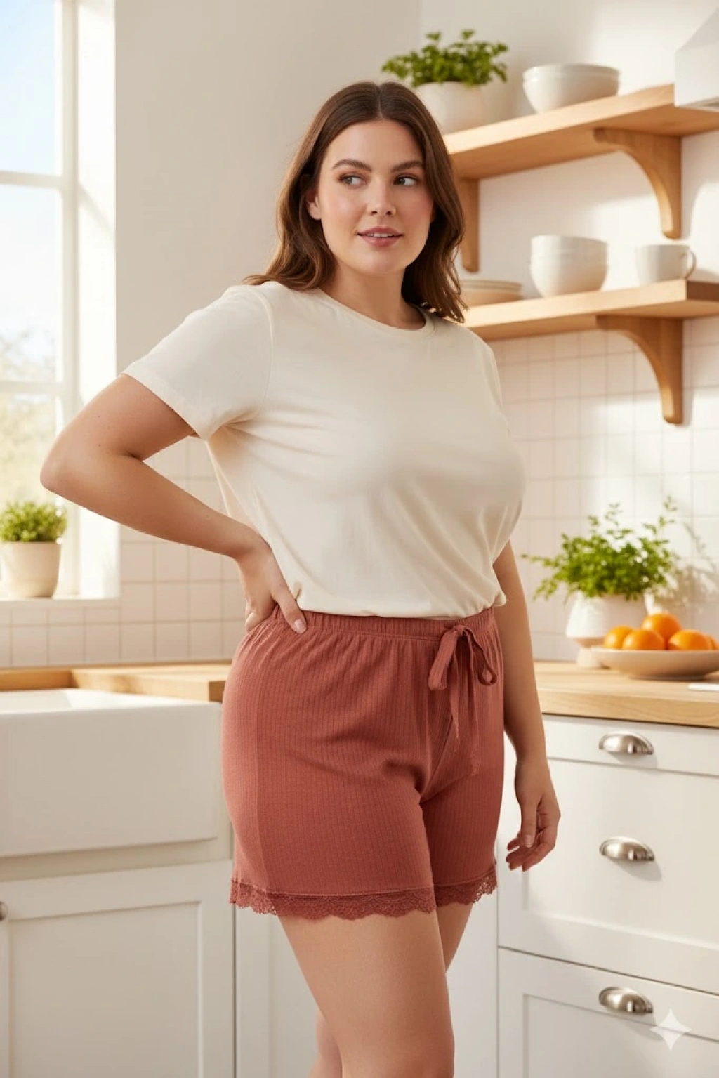 HERŞEYTREND Bambu Fitilli Kadın Ev Şortu Bacak Dantel Detaylı Ev Giyim Taba