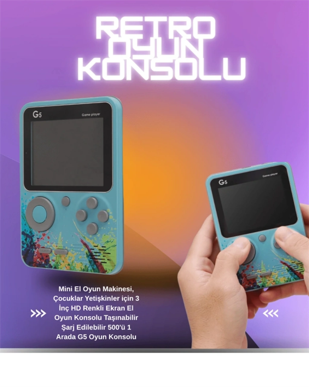 Gelişmiş renkli 3 inç LCD ekranı, oyun deneyimini daha net ve canlı hale getirirken, ergonomik tuş yerleşimi sayesinde uzun süreli kullanımda konfor sağlar. Oyunlar doğrudan cihazın hafızasına yüklü olarak geldiği için ekstra indirme, kurulum veya internet bağlantısına gerek yoktur. Ayrıca cihaz, AV kablo yardımıyla televizyona bağlanarak daha büyük ekranda da oynanabilir – bu özellik özellikle ailece eğlenmek isteyenler için büyük avantaj sunar.USB kablo ile şarj edilen dahili bataryası, tek şarjla uzun süreli kullanım sağlar. Elektrik bağımlılığı olmadan özgürce oyun oynayabilirsiniz. Dayanıklı plastik kasası, düşmelere ve çizilmelere karşı dirençlidir. G5 Game Box, hem geçmişin oyunlarını yaşatmak isteyen yetişkinler hem de keşfetmeye hevesli çocuklar için eğlenceli, kullanışlı ve duygusal değeri yüksek bir cihazdır.