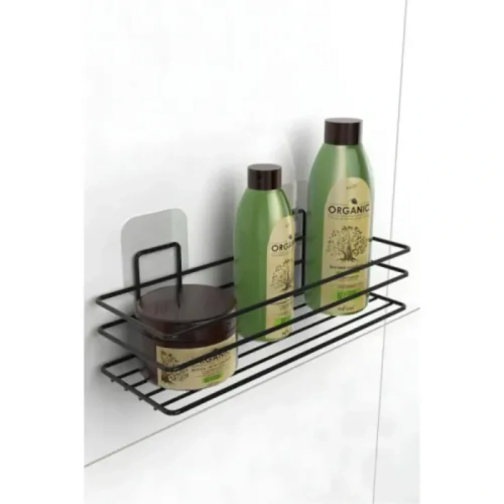 Yapışkanlı Duş ve Banyo Rafı – SiyahÜrün Açıklaması:Yapışkanlı duş ve banyo rafı, banyoda delme işlemi yapmadan pratik bir şekilde düzen sağlamanıza yardımcı olur. Siyah kaplamalı paslanmaz metal malzemeden üretilmiş olup paslanmaya karşı dayanıklıdır ve uzun ömürlü kullanım sunar.Üç telli koruma kenarlığı, ürünlerinizin düşmesini önlerken, açık taban tasarımı su birikimini engeller ve hijyenik bir kullanım sağlar. Şeffaf yapışkan panel sayesinde banyonuza, duş alanınıza veya lavabo yanına kolayca monte edilebilir.Ortalama 3-5 kg taşıma kapasitesi ile şampuan, sabun, duş jeli ve benzeri ürünleri kolay erişilebilir biçimde organize edebilirsiniz. Modern ve şık tasarımı ile banyo estetiğini bozmadan kullanıma uygundur. Ayrıca mutfak veya diğer ıslak alanlarda da rahatlıkla kullanılabilir.Ürün Özellikleri:Delme gerektirmez: Kolay ve hızlı montajPaslanmaz Malzeme: Siyah kaplamalı metalÜç Telli Koruma Kenarlığı: Ürünlerin güvenliğini sağlarAçık Taban Tasarımı: Su birikmesini önlerTaşıma Kapasitesi: 3-5 kgÇok Amaçlı Kullanım: Banyo, duş, lavabo ve mutfakta kullanım